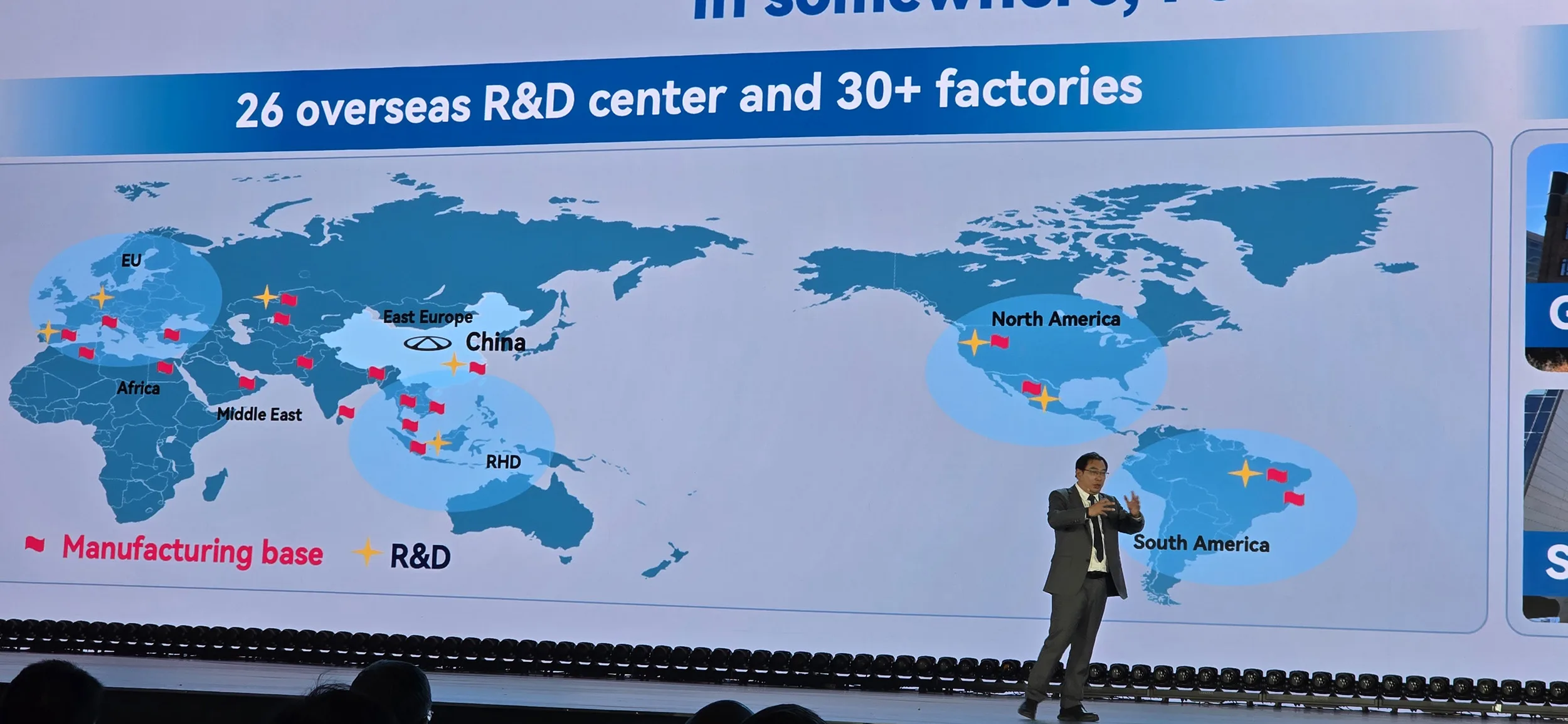 Sunumda Zhang Guibing, Chery’nin gelecekte global ölçekte toplam 26 Ar-Ge ve 30 üretim merkezine ulaşmayı planladığını açıkladı.